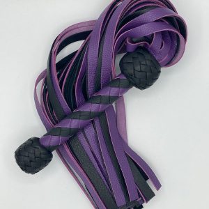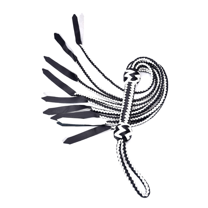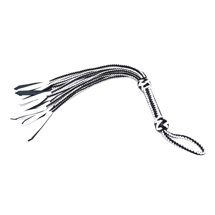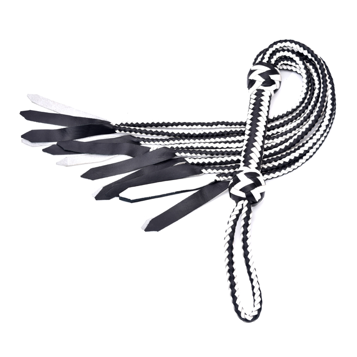 This handcrafted black and white braided leather flogger is made with durable, high-quality materials. The firm woven handle ensures a secure grip, while the soft leather tails provide smooth, controlled movement. Ideal for cosplay, theatrical performances, training demonstrations, photography props, and decorative collections. A stylish, long-lasting accessory with a bold two-tone design.