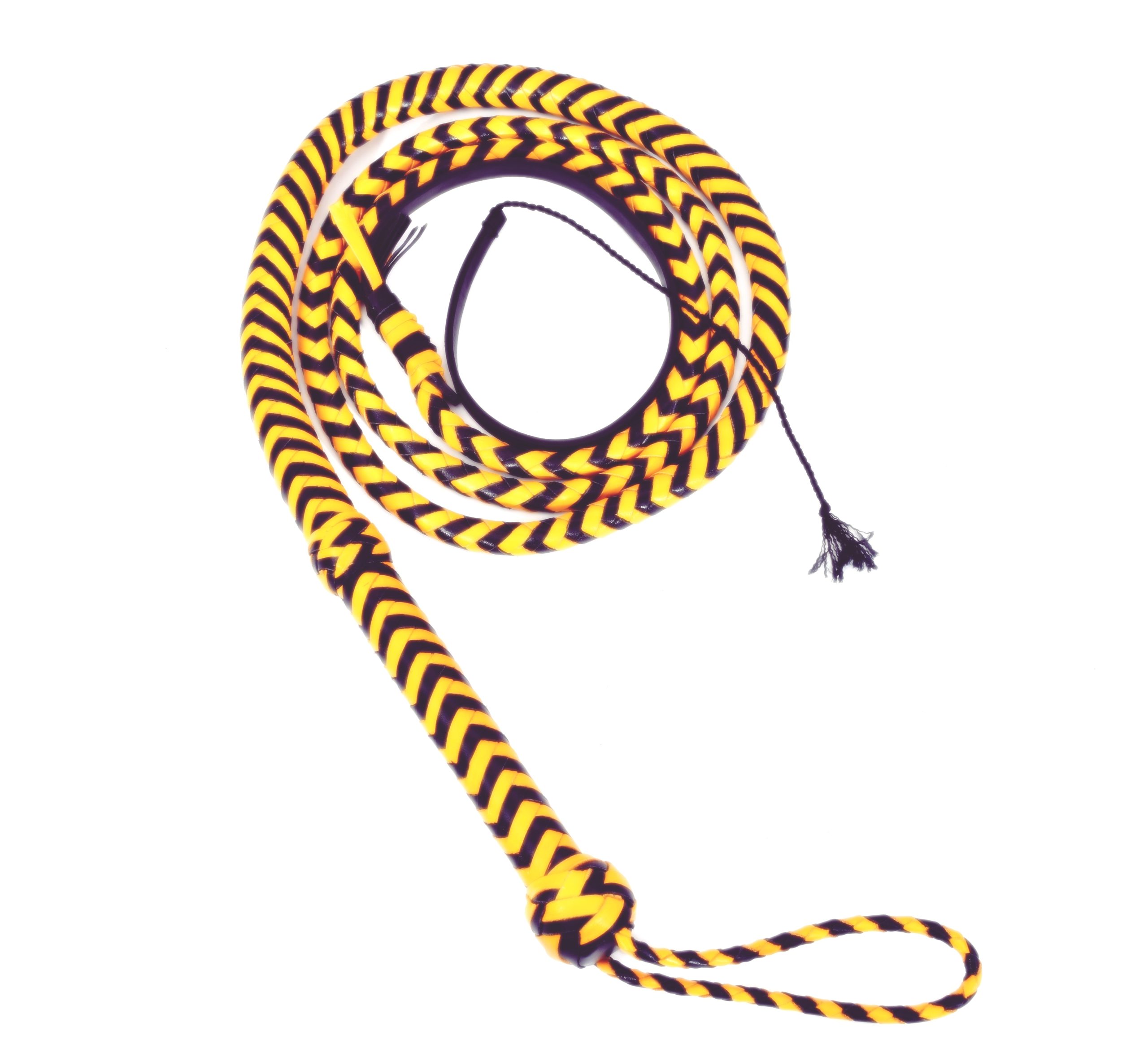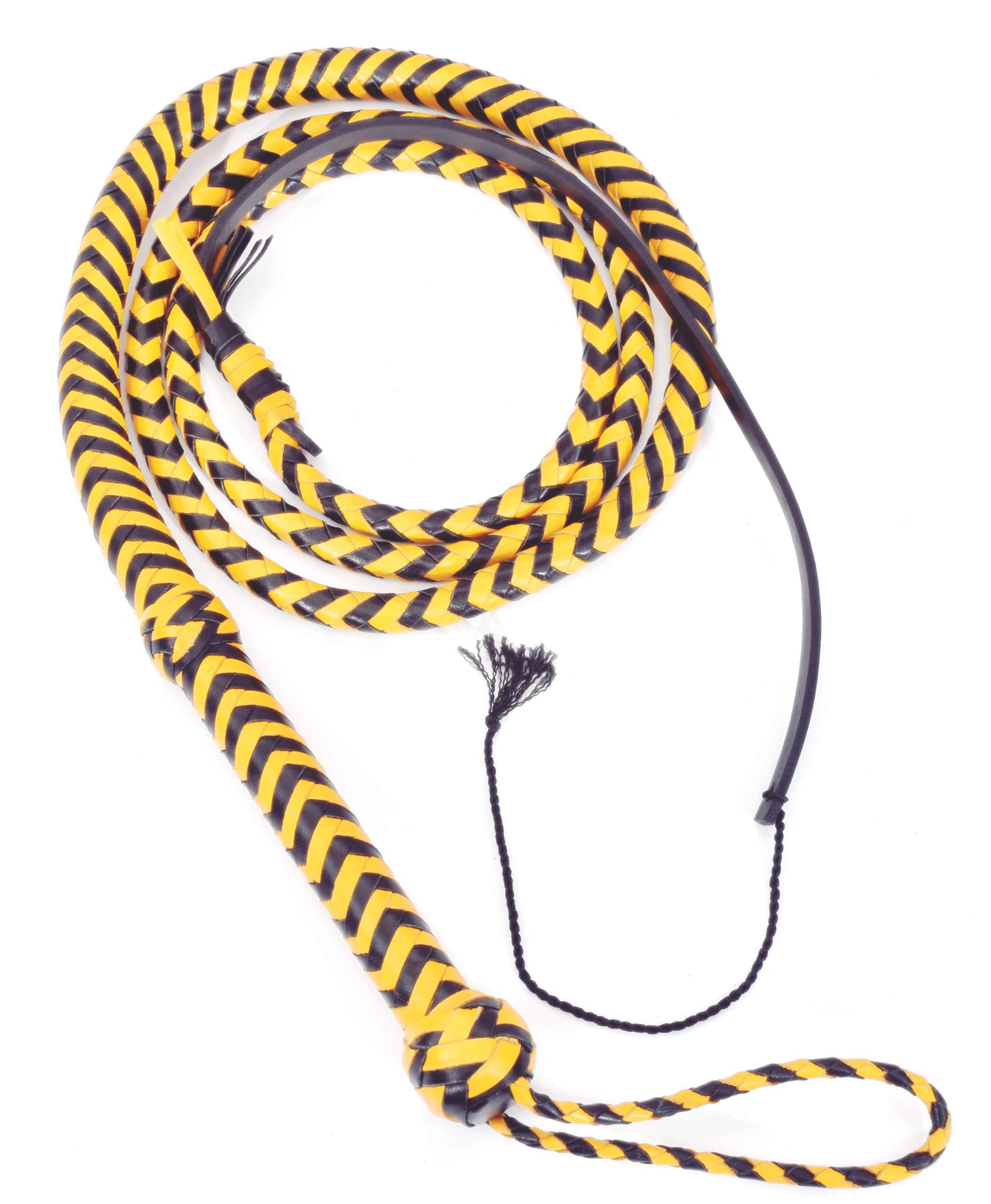 Hand-Braided Leather Bullwhip – 12-Plait Yellow & Black Cowhide Bull Whip – Professional Weighted Whip with Wrist Loop