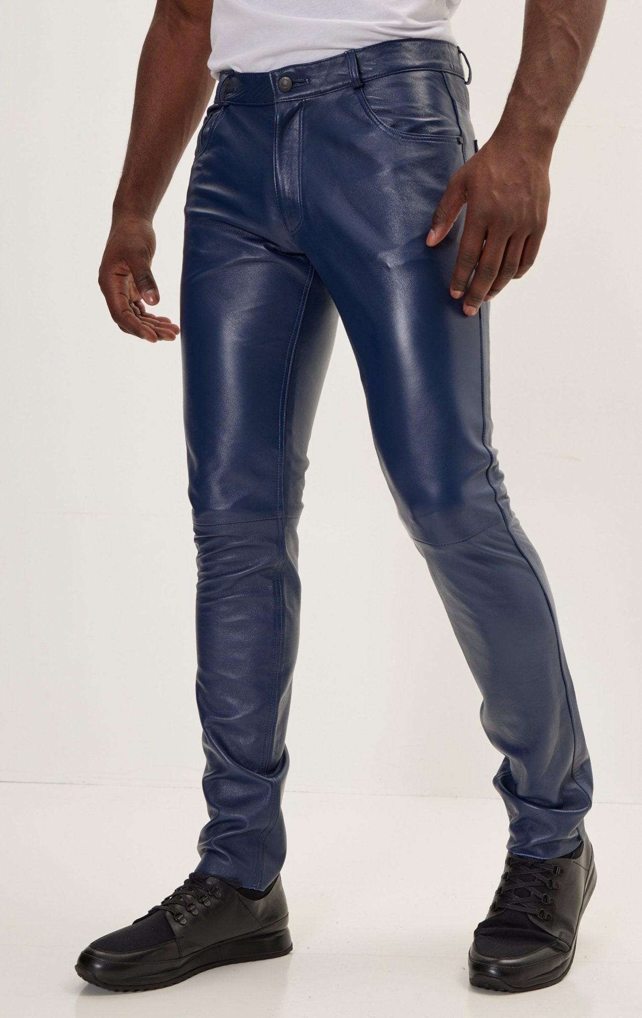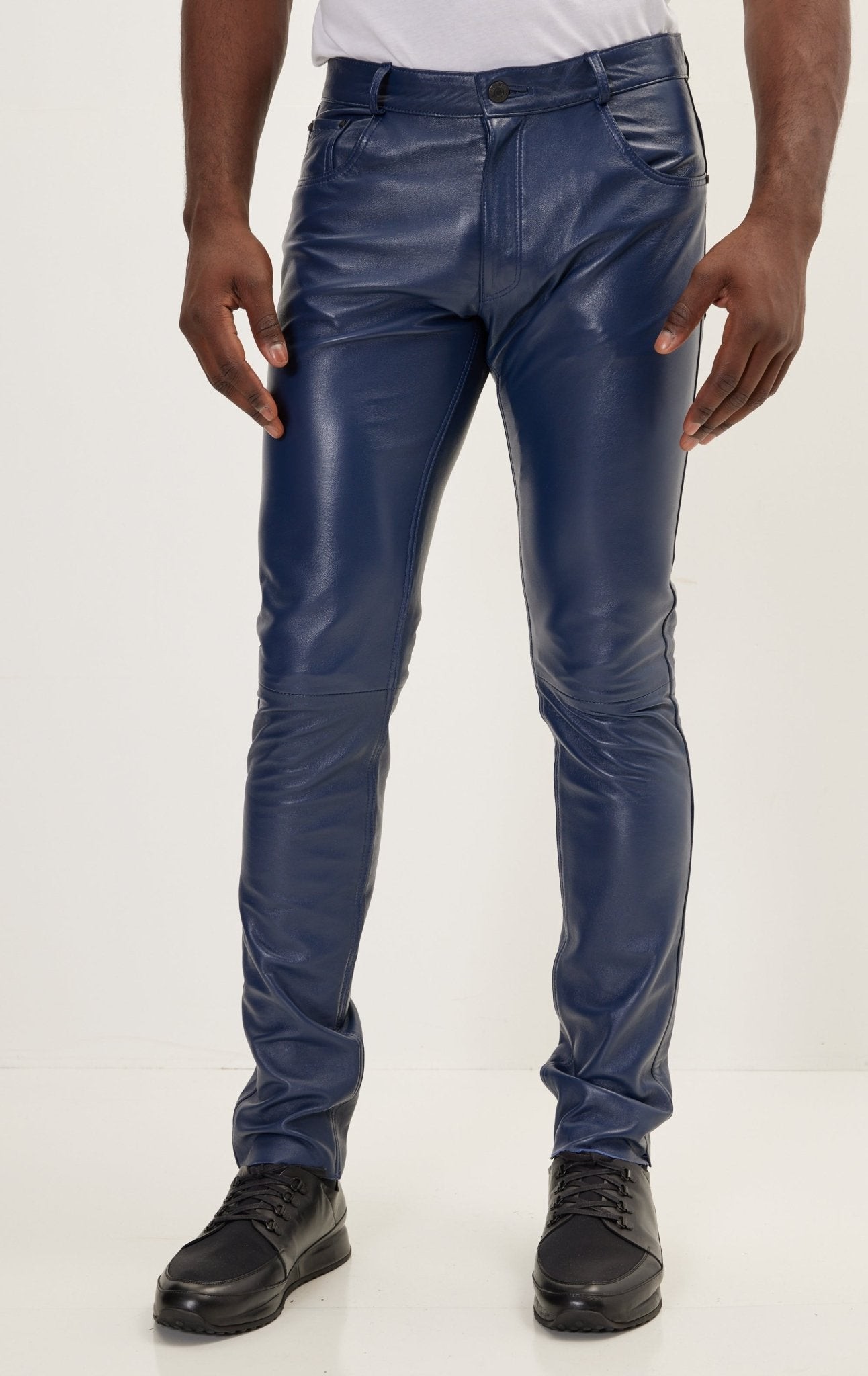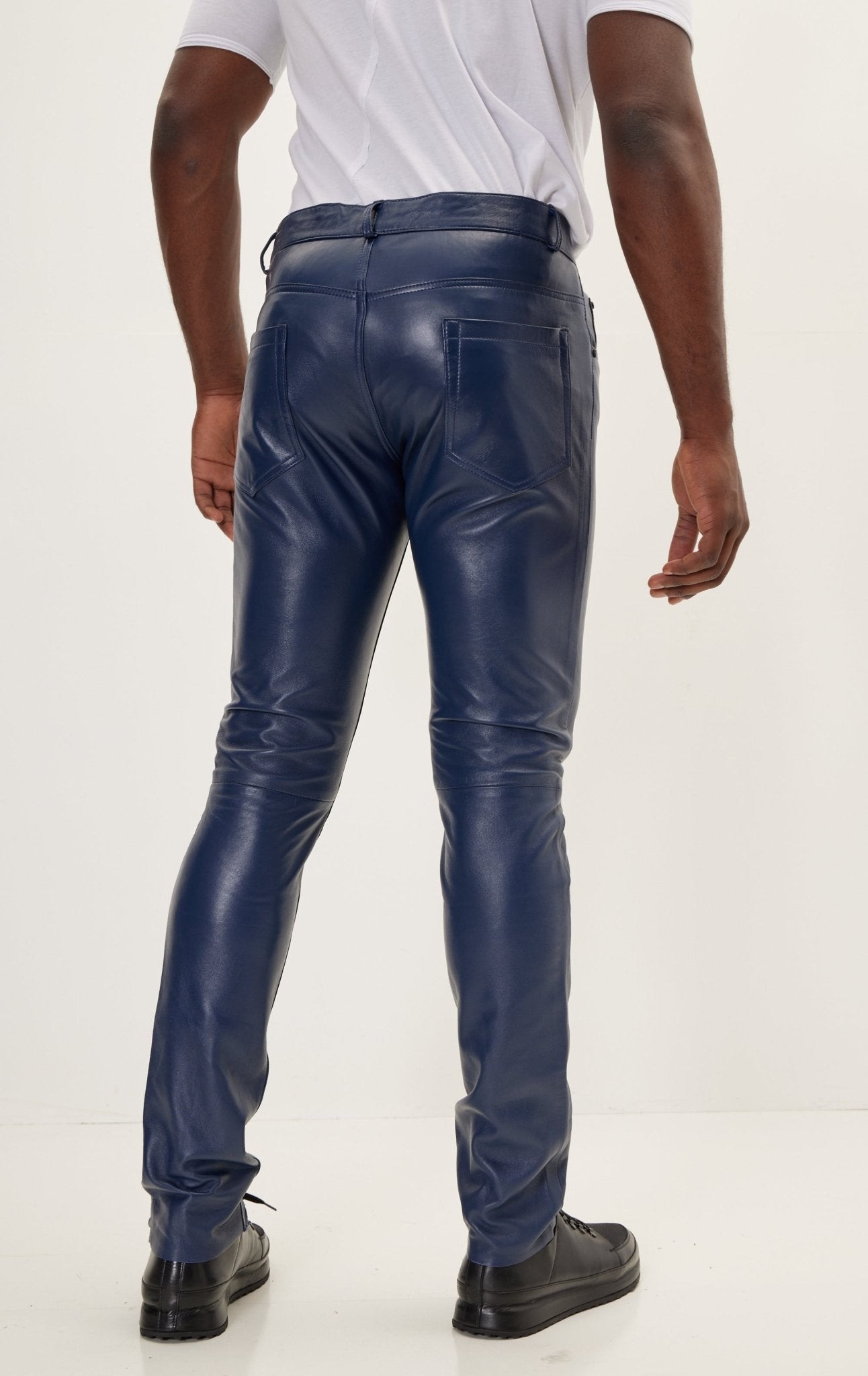 Men’s Blue Leather Pants – Slim Fit Genuine Leather Trousers for Modern Street & Party Wear