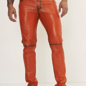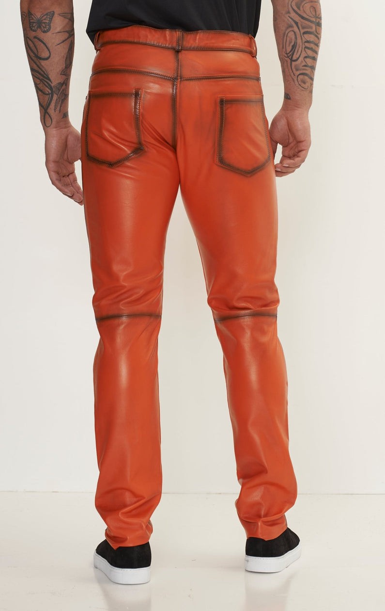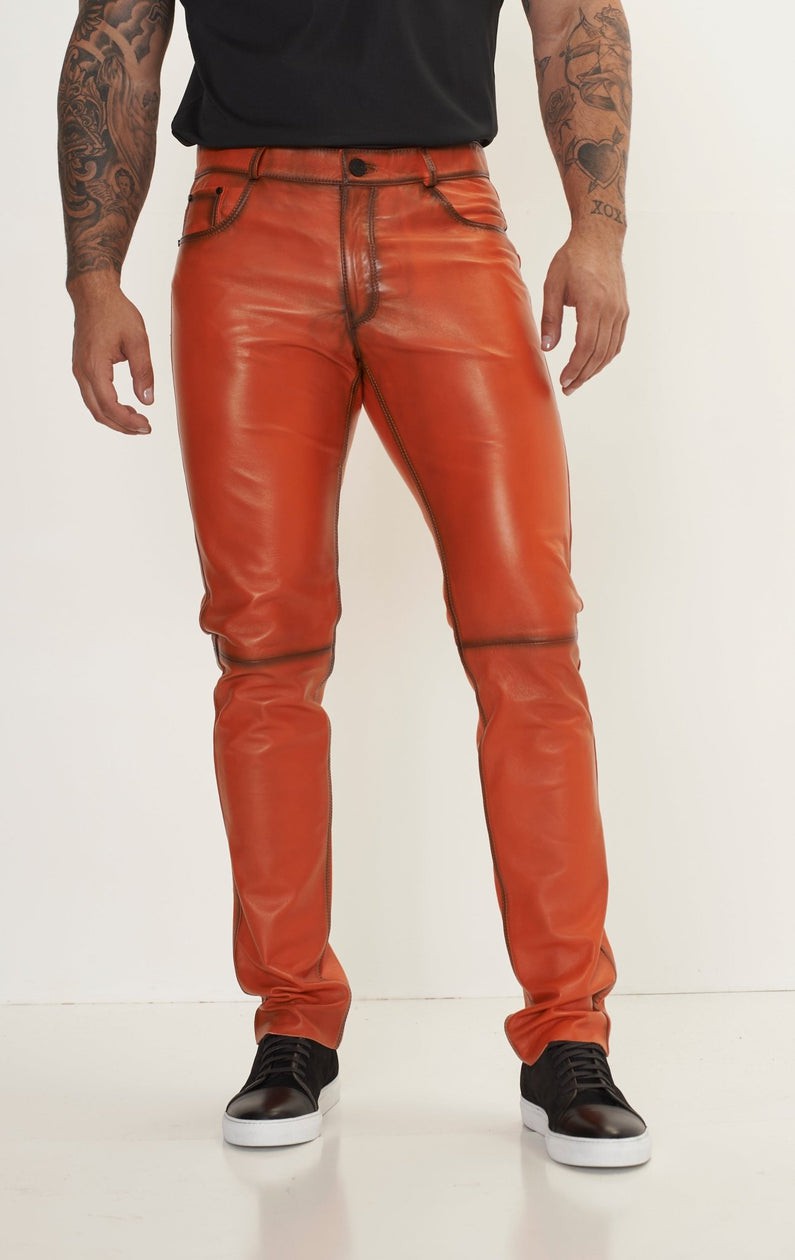 Men’s Burnt Orange Genuine Leather Pants – Slim Fit Designer Leather Trousers