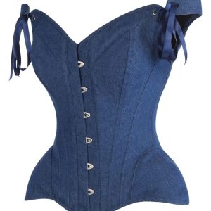 Be the first to review “Overbust Denim Corset Top with Off-the-Shoulder Ribbon Sleeves – Steel Boned Victorian Style”