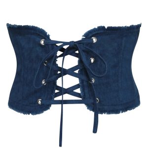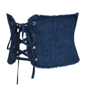 Women’s Raw Hem Denim Corset Belt – Dark Wash Frayed Waist Cincher with Boning