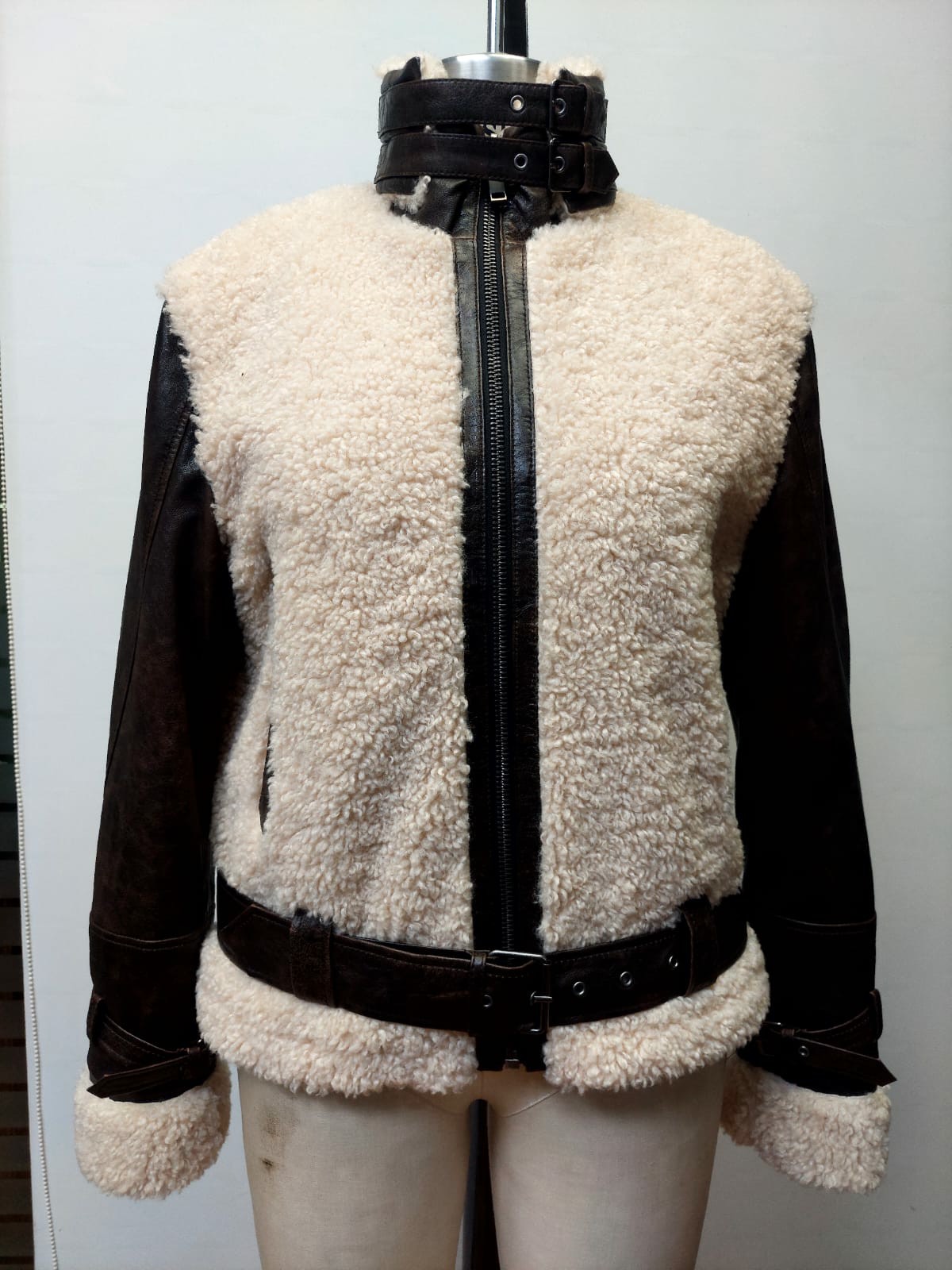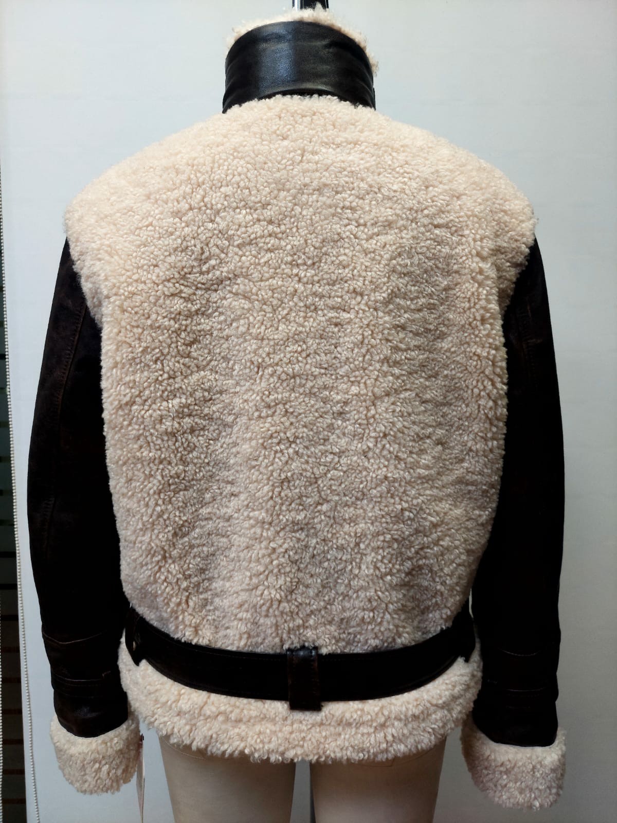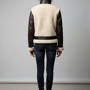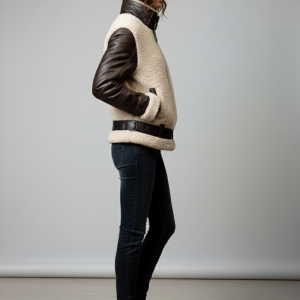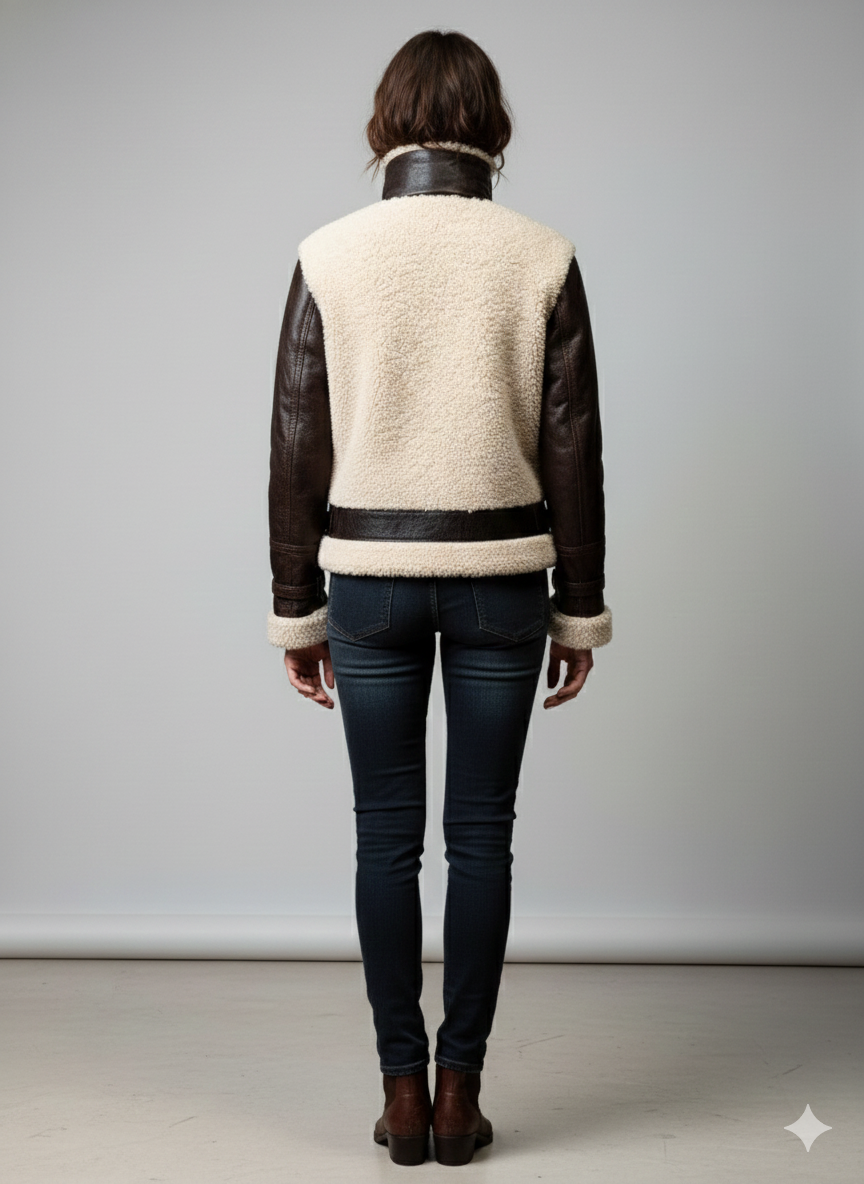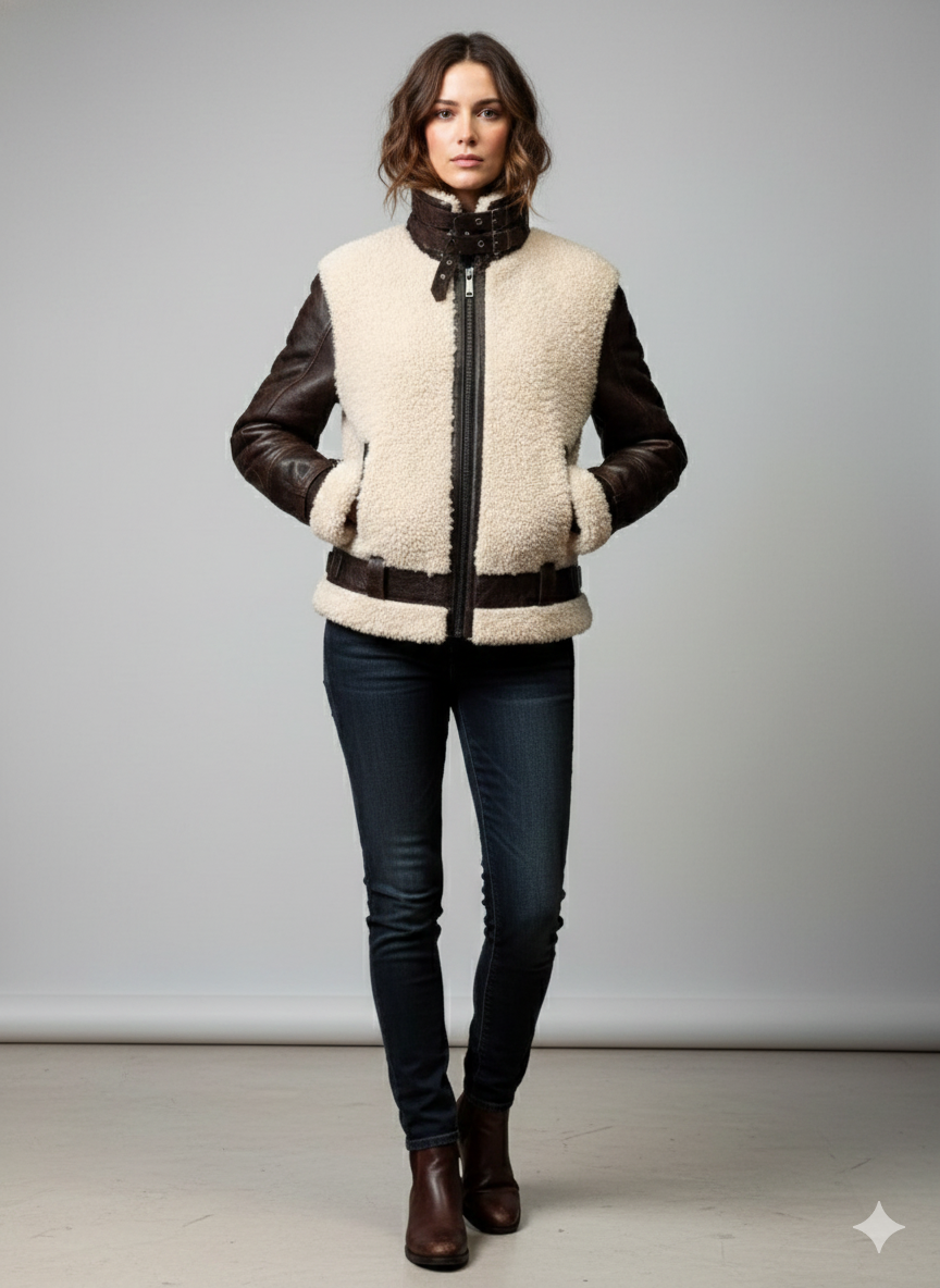 Be the first to review “Women’s Shearling Leather Jacket – Black & Cream Faux Fur Aviator Biker Jacket with Belted Waist”